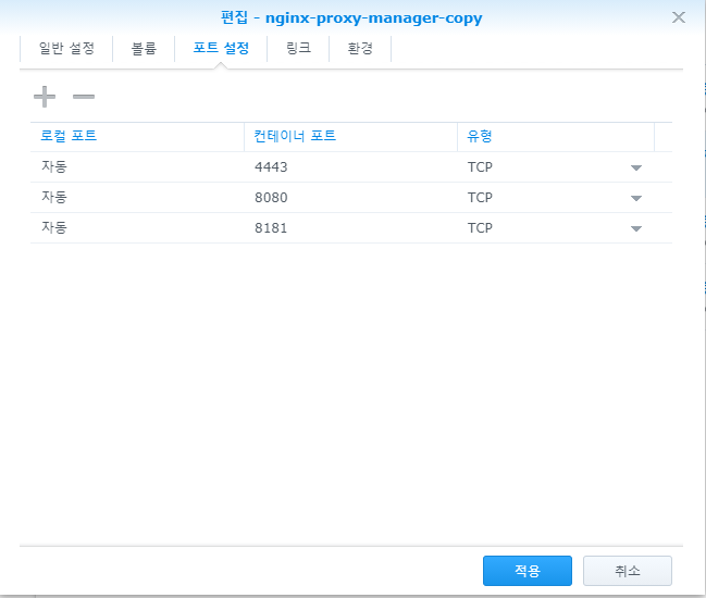 NPM 도커에서 4443,8080,8181을 이용할거니 이미 쓰고 있는게 있다면 다른걸로 바꿔준다