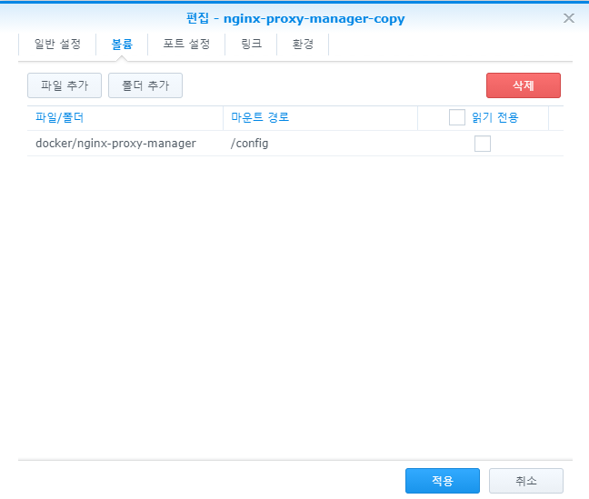 볼륨탭에서 마운트 경로를 적당히 해주고...