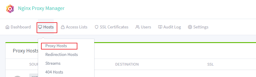 Hosts 에서 Proxy Hosts 들어가서 오른쪽에 add 누른 후