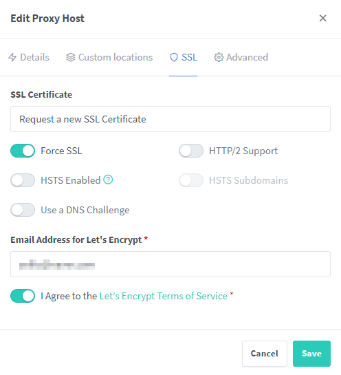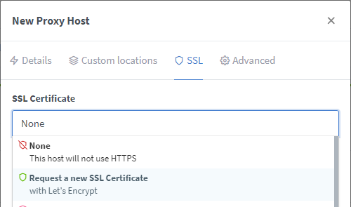 추가된 Proxy Host 에서 수정 들어간 후 SSL 탭에서 두번째