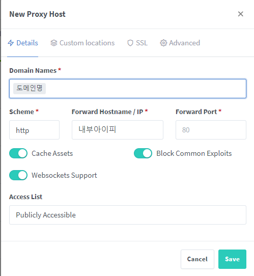 도메인명입력 하고 내부아이피 입력하고 포트는 본인이 원하는 포트로 입력한다
