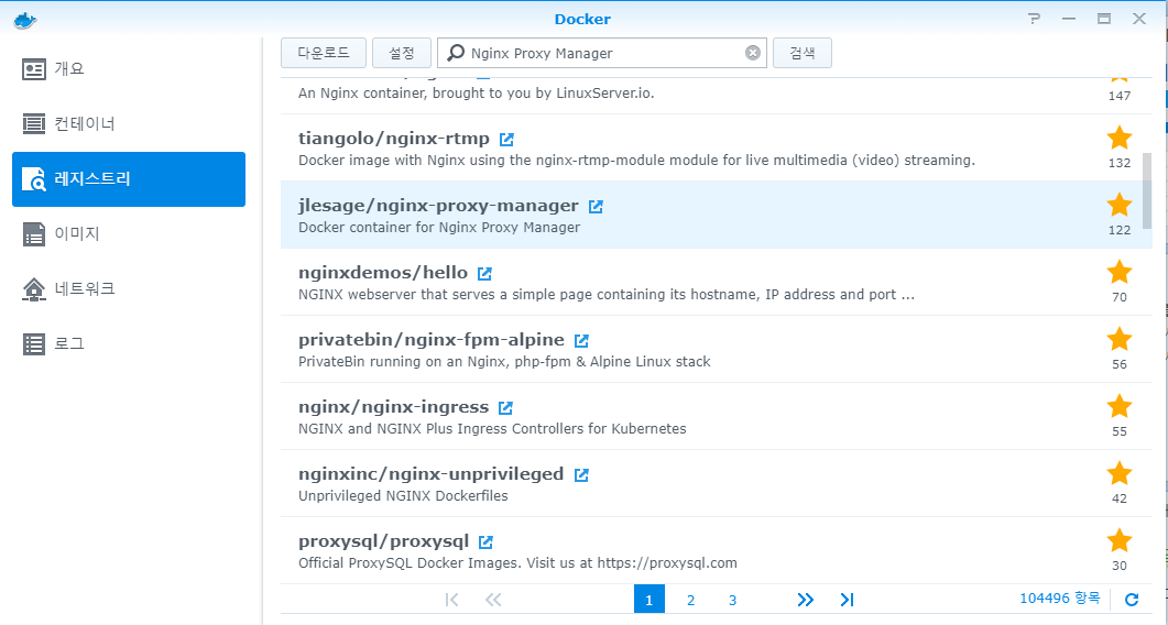 도커에서 jlesage/Nginx Proxy Manager 를 찾아서 설치를 합니다.
