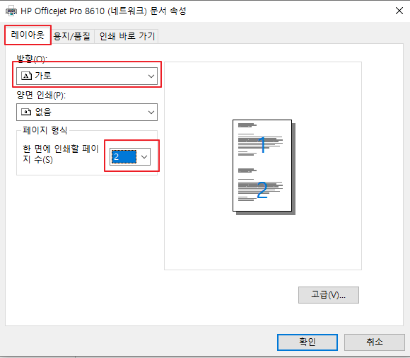 프린트마다 틀리지만 레이아웃이라는 탭이 있습니다. 거기 들어가서 방향은 가로로 설정하고