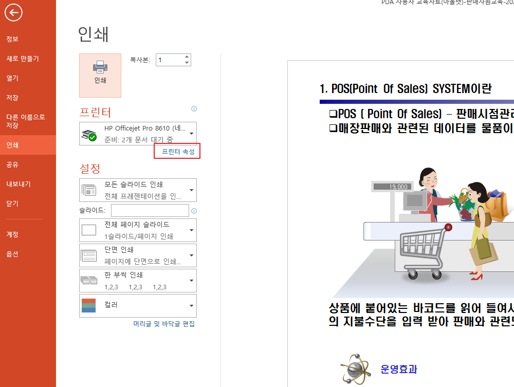 PPT를 열어서 인쇄를 누르면 위와 같이 나옵니다. 여기서 인쇄를 원하는 프린터를 선택 후 프린터 속성에 들어갑니다.