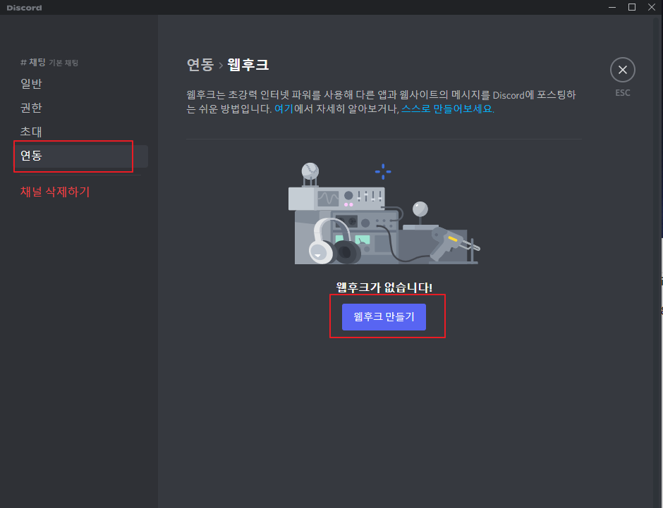 왼쪽에 연동하기 누르고 가운데 웹후크 만들기를 실행 합니다.