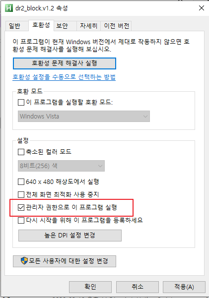 매번 관리자권한으로 실행하기 귀찮다면 파일속성에서 할수있다.