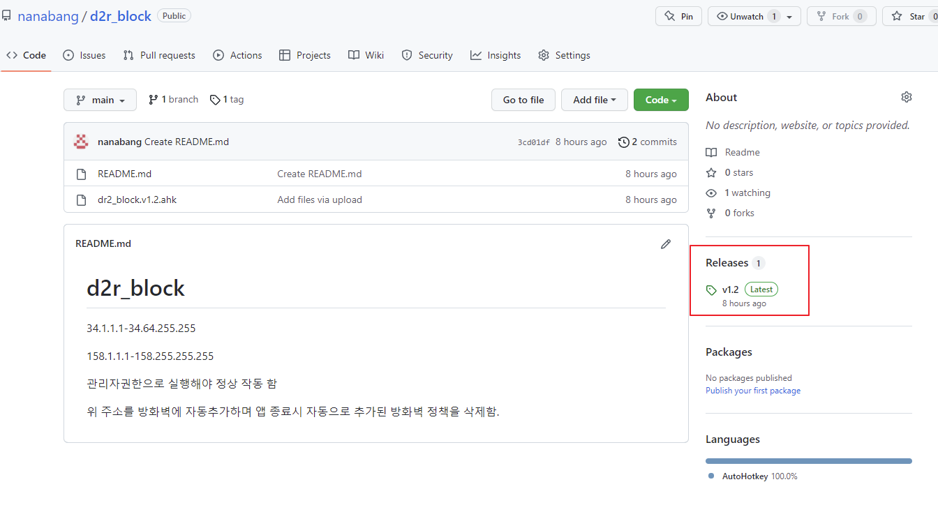 난 오토핫키 할줄 모른다고한다면 exe로 만든파일을 우측 빨간색 박스에 릴리즈 다운받을수 있도록 해놨다.