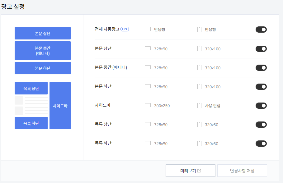 위 사진처럼 광고들을 자동(반응형) 으로 하지말고 수동으로 변경 해준다. 끝~@@
