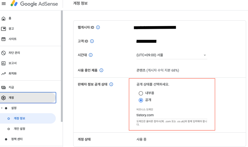 아래처럼 판매자 정보 공개 상태를 공개하고 도메인을 tistory.com 으로 한다.