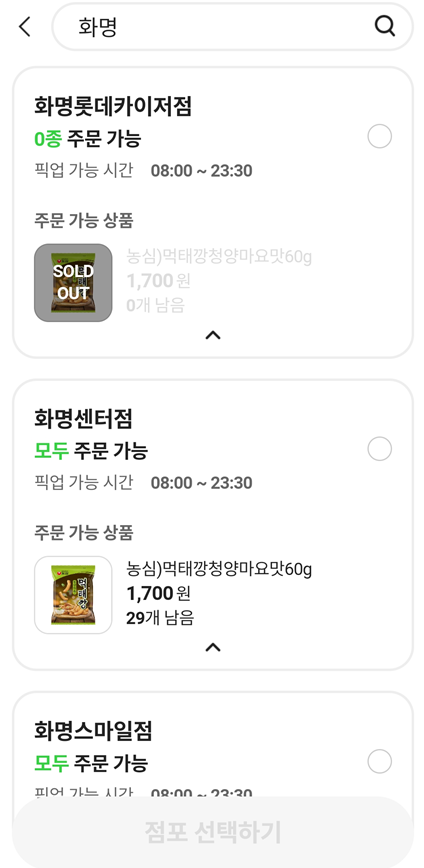 여기서 우선 거리순으로 나옵니다 재고부족이 안뜨면 당연히 있는거죠