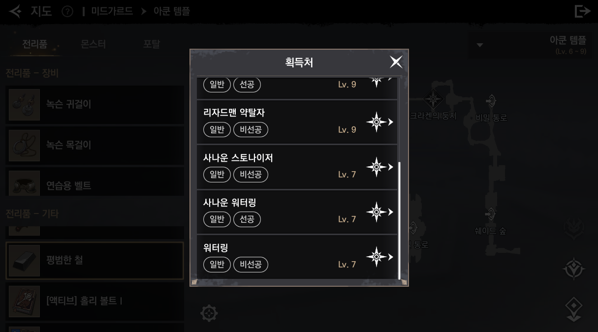 철이 있습니다 그걸 클릭하면 나오는 획득처에서