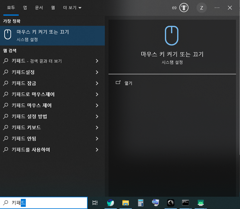윈도우 검색창에 키패드를 입력하고 "마우스 키 켜기 또는 끄기" 를 실행