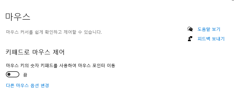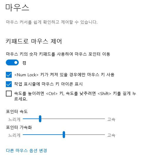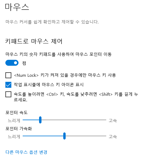 마우스 키의 숫자 키패드를 사용하여 마우스 포인트 이동을 끔에서 켜기로 바꿈