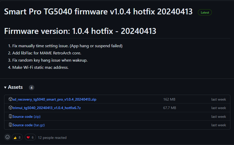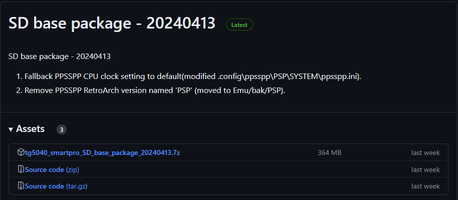 위 링크 들어가서 하단에 trimui_tg5040_20240413_v1.0.4_hotfix6.7z 를 받아준다