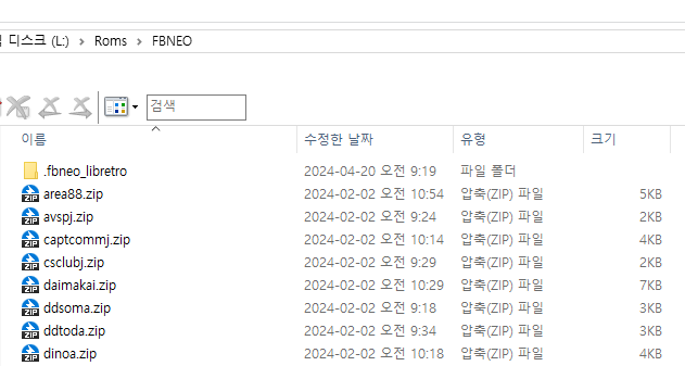 그리고 두번째는 부모롬파일인데 Roms\FBNEO 폴더안에 바로 zip 파일이 보이도록 넣어준다