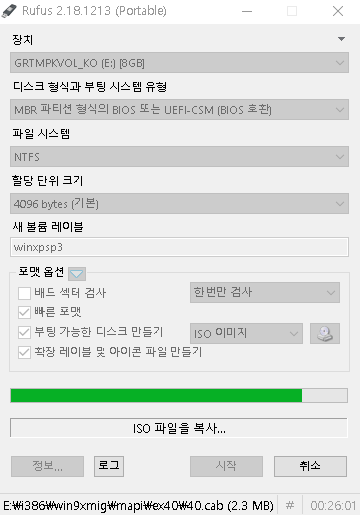 rufus 프로그램을 이용하여 usb를 제작하였지만