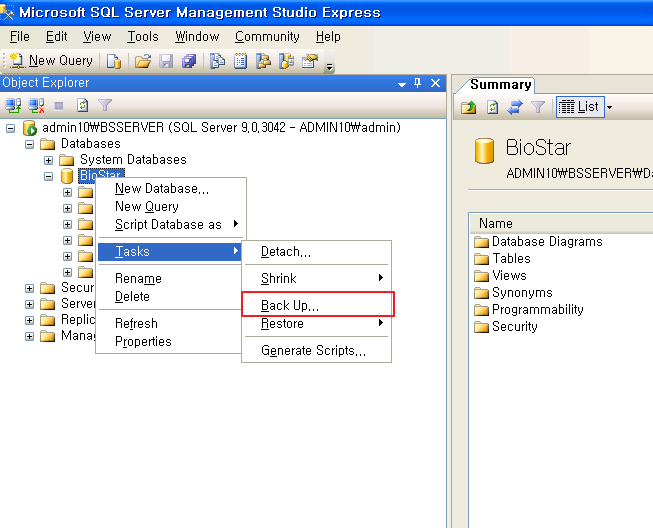 데이타베이스 에서 바이오스타를 우클릭 하여 백업 눌러주시고