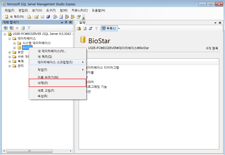 그리고 기존 바이오스타 DB를 삭제하여 날려 줍니다
