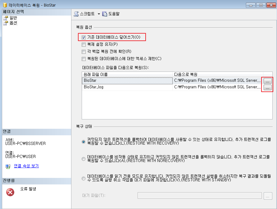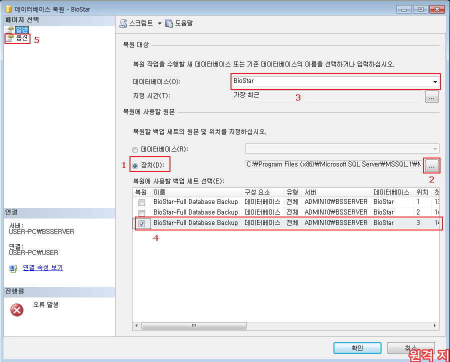 2. 백업파일 기존 pc에서 가져온 bak 파일 위치 (위치는 웬만하면 기존과 동일하게...)