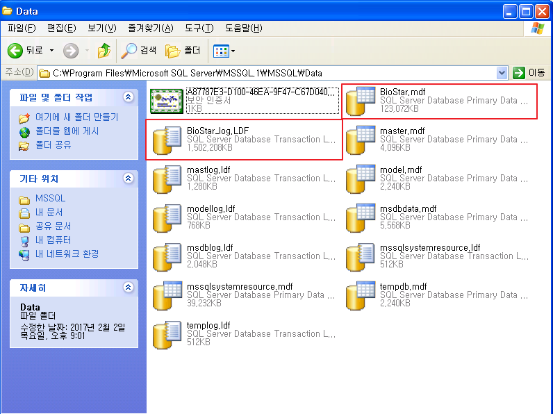 mdf 파일과 LDF 파일 의 위치를 잡아줍니다 (32비트와 64비트는 폴더 위치가 달라서 바꿔줘야합니다)