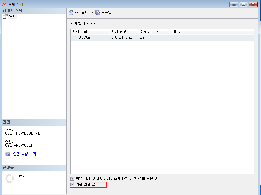 오류가 나면 [기존 연결 닫기] 체크 하시고 삭제 하면 됩니다.