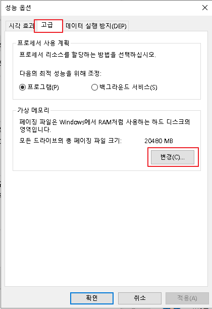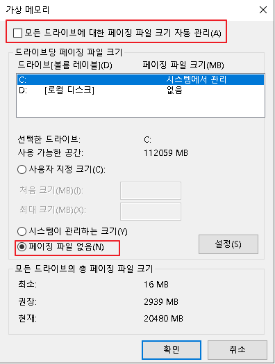 모든 드라이브에 대한 페이징 파일 크기 자동 관리가 체크 되어있는데