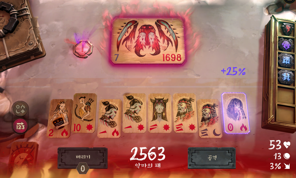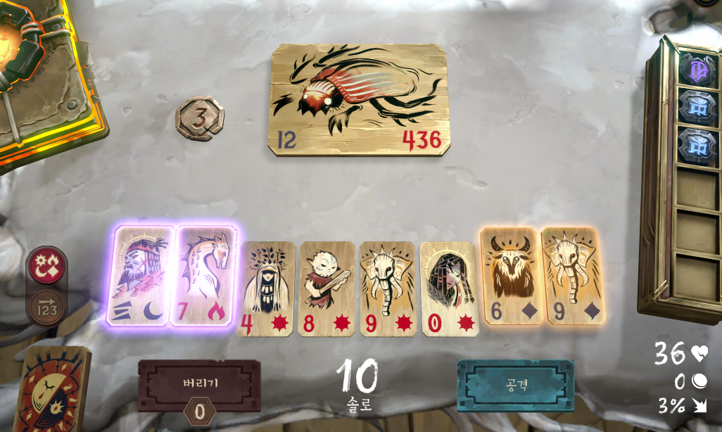 이런식으로 초반엔 빨간달 5개 맞출땐 4개 제외한 나머지 모두를 공격카드로 써버리면 됩니다.