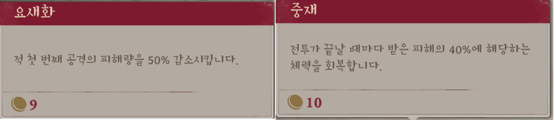 초록색 인장은 중재(전투 끝나고 체력 회복)이나 요새화(첫데미지 반감) 둘중 하나 가져가면 좋습니다.